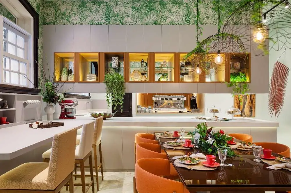 - Vidro: o vidro é frequentemente usado em mesas e detalhes de armários. Ele cria uma sensação de abertura e leveza, além de ser fácil de limpar e manter.